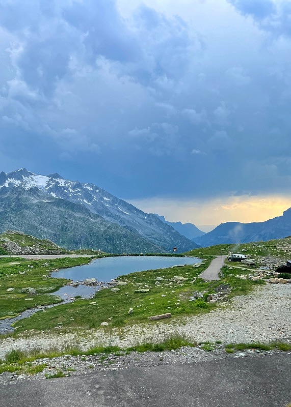 Meillä oli alunperin tarkoitus viettää seuraava yö Sustenpassin varrella isolla parkkipaikalla (karttalinkki parkkipaikalle). Vietimme täällä useamman tunnin nauttien sopivasta ilmasta, sillä alhaalla oli edelleen yli 35 astetta lämmintä.